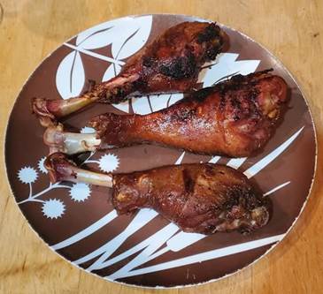 The giant turkey legs ended up in the brine for about 4 hours before they went on the grill. I’m not sure it was long enough because they still came off a little bit dry. Here is what they looked like when they were done (my food photography skills need some work):
